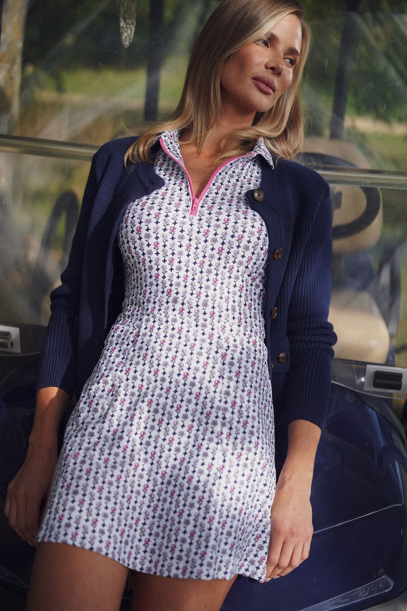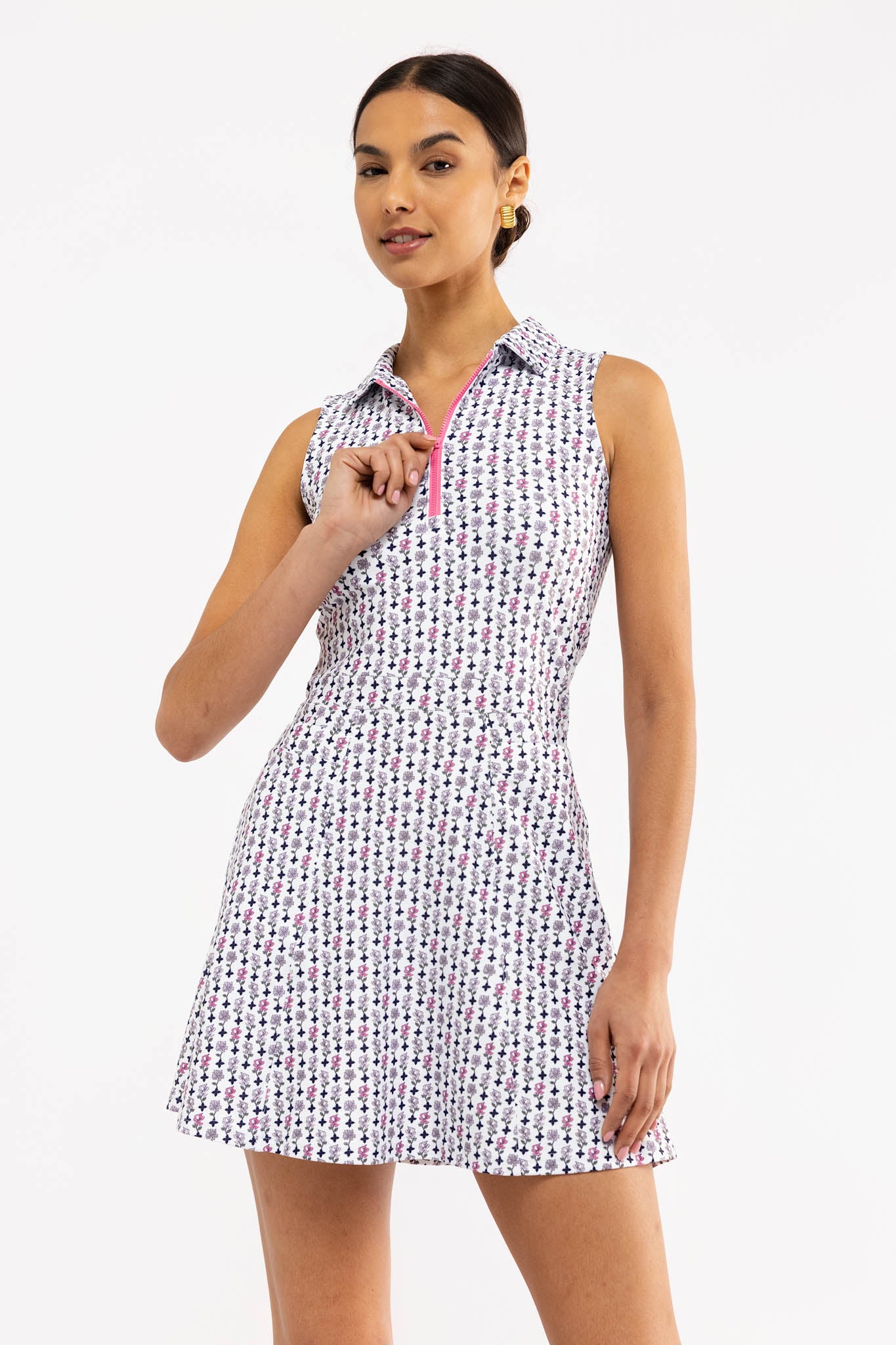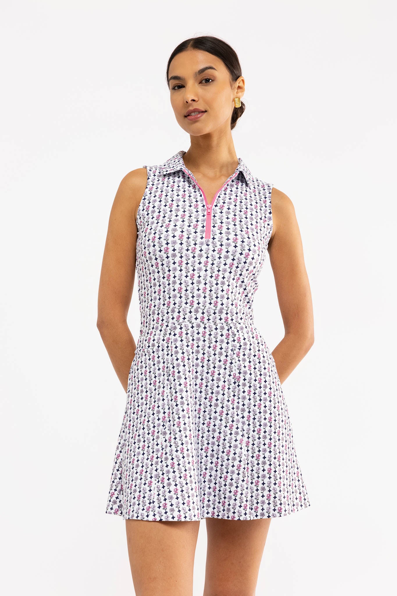 Meet the Cynthia Dress. Crafted from our S&Q Stretch fabric, the Cynthia features a sleek, collared neckline with a quarter-zip front and functional side pockets.